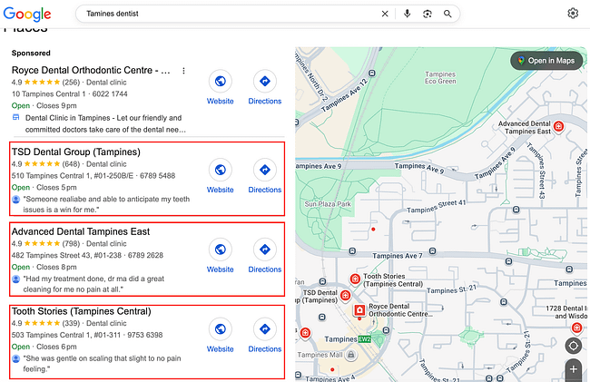 “Dentist in Tampines.” “Dentist in Bedok.” “Dentist near me.” Thanks to semantic search, Google Maps understands this and recommends dental clinics near wherever the user searches. This applies whether on Google search or directly in the Maps app.