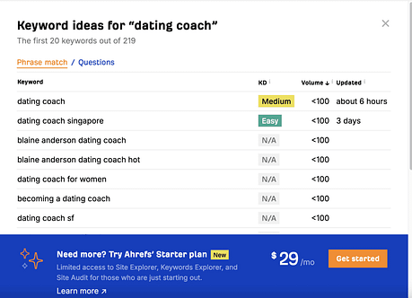 The commercial keyword “dating coaching Singapore” also only had 20 searches a month back then. Yes, I sold my first ever $497 dating advice program by ranking at the top of Google. I started by copywriting, hoping someone would read my blog posts. I failed miserably and returned to full time university.