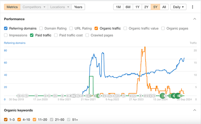 The site was registered on 5th July 2021 and was generally inactive until September 2021. I started to build some backlinks using the Skyscraper method and did some guest posts towards the end of 2021. However, life got in the way and I left it inactive till June 2024.