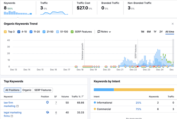 These reports are taken when I am rejigging my site, and midway through an entire overhaul of SEO content audit. Hence, don’t mind the statistics. Yet I am organically ranked for a couple of legal marketing keywords.
