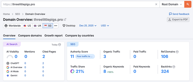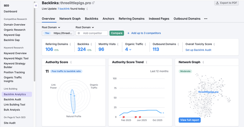 Nonetheless, it’s good to get a rough gauge of the backlinks pointing to your site. For a single site, I usually use a manual eye test of the site’s content. I also pop the site into Semrush/Ahrefs domain checker to look at ranked content.